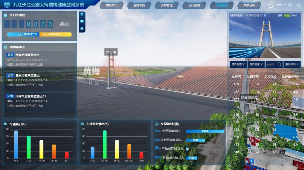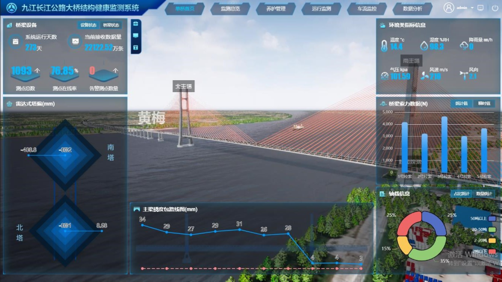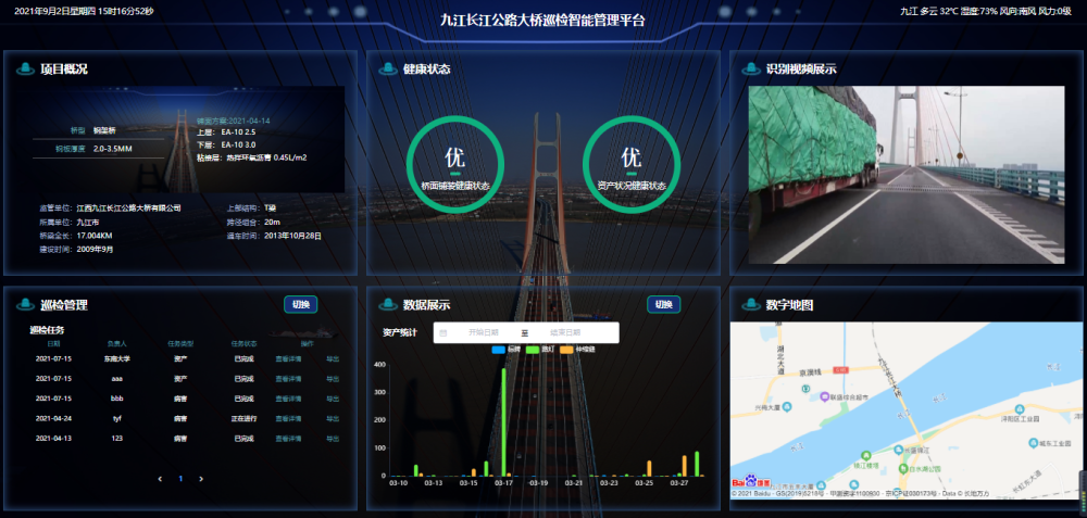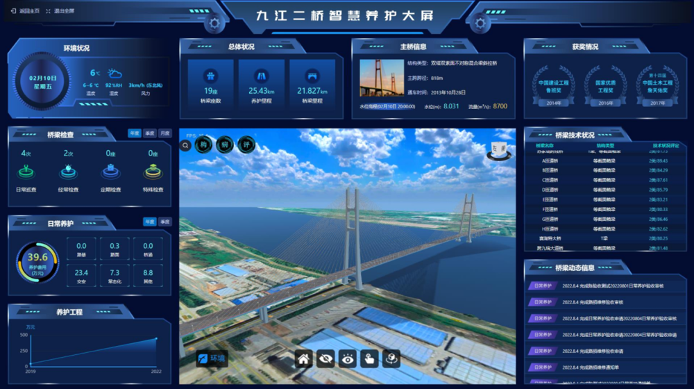 在九江二橋監(jiān)控中心,打開電子管理平臺(tái)系統(tǒng),大橋各個(gè)部件運(yùn)行情況,道路運(yùn)行情況和施工現(xiàn)場便一目了然,不僅讓道路全過程管理成為現(xiàn)實(shí),還大大提高了工作效率。九江二橋通過運(yùn)營管理、養(yǎng)護(hù)管理、大橋健康監(jiān)測管理、道路智能化監(jiān)測管理等一系列智慧平臺(tái)的建設(shè),全面提升高速公路“管、養(yǎng)、運(yùn)、服”水平。