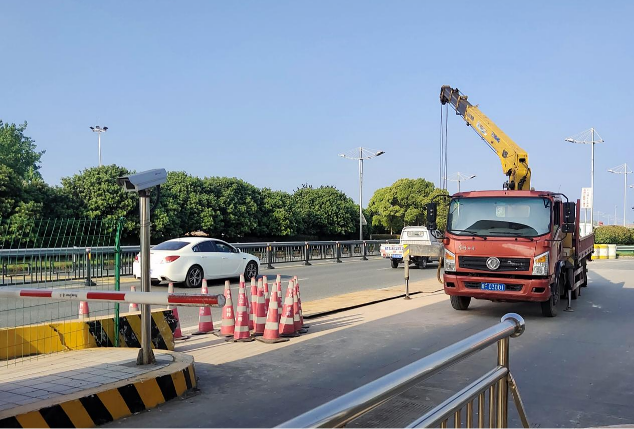 該站管理人員經情況核實,第一時間向公司報告,積極協(xié)調工程養(yǎng)護及安全環(huán)保部門,聯(lián)合轄區(qū)交警路政及相關單位共同研究該車輛的通行方案。在確認該車輛持有《大件運輸車輛通行公路橋梁結構檢算報告》后,決定臨時拆除收費站入口部分隔離墩、隔離柵片網、伏地護欄等防護設施,同時鋪設鋼板,為車輛安全通行提供保障。