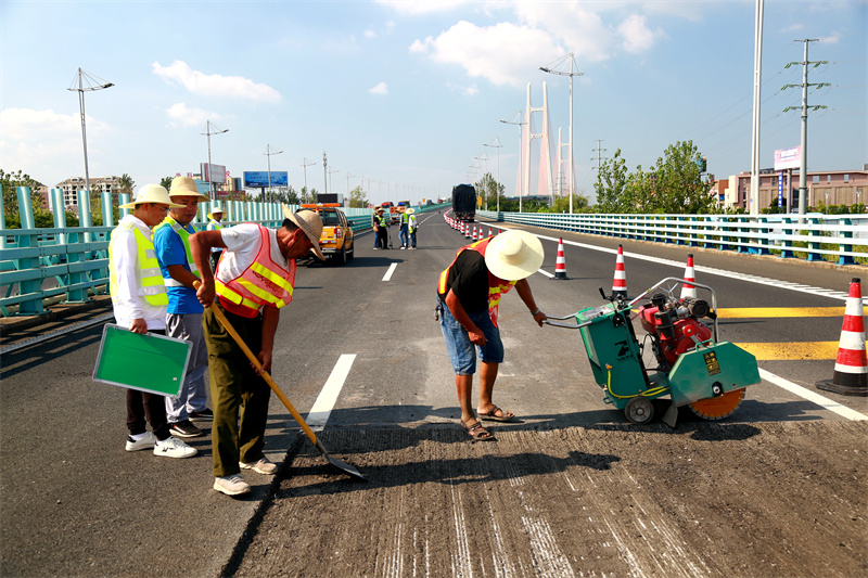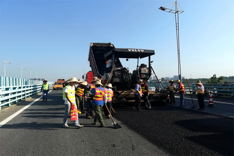 三伏天,在九江地區(qū)“蒸籠模式”下,橋面施工現(xiàn)場一片熱火朝天,坑槽修補、路面銑刨、攤鋪瀝青等工程施工相繼進場,路面檢測、交安設(shè)施換新、路域環(huán)境治理、路網(wǎng)編號調(diào)整等工程項目有序開展。施工人員和管理人員在現(xiàn)場揮汗如雨,咬緊時間節(jié)點,保質(zhì)保量完成國評各項目標任務(wù)。