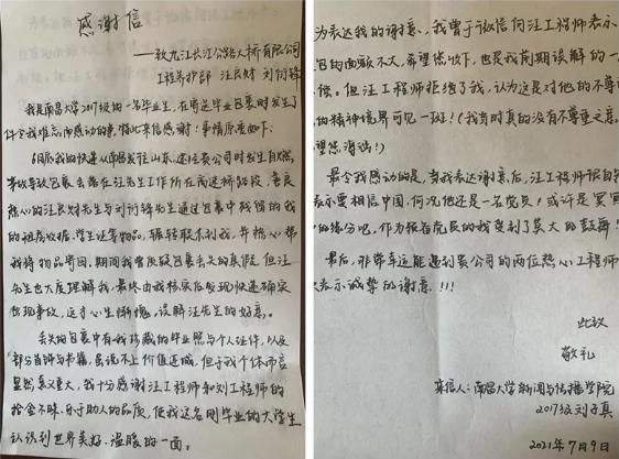 事情要從2021年6月28日凌晨說起,一輛從南昌發(fā)往山東的快遞運(yùn)輸車,途徑九江二橋高速路段發(fā)生車輛自燃事故,在搶救過程中,因消防水槍沖刷,部分包裹已經(jīng)損毀。為盡快恢復(fù)交通秩序,避免造成二次事故,我司立即組織工程養(yǎng)護(hù)部前往事故現(xiàn)場(chǎng)清理遺留殘物。在清理過程中,養(yǎng)護(hù)工程師汪良財(cái)和劉衍峰發(fā)現(xiàn)一個(gè)十分特別的包裹,里面不僅有畢業(yè)證等重要證件,還有部分首飾和書籍,考慮到這些物品對(duì)失主十分重要,工程部立即組織信息比對(duì),通過收集到的租房收據(jù)和學(xué)生證等物件,聯(lián)系到了南昌大學(xué)的教務(wù)處老師,又經(jīng)幾番周折、再三核實(shí)確認(rèn)后,與證件主人劉同學(xué)取得聯(lián)系,歸還了所收集的全部物件。