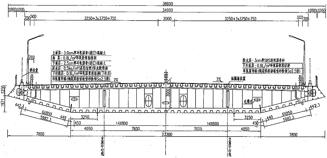 原鋼橋面鋪裝層為上面層:2.5cm 厚環(huán)氧瀝青(進(jìn)口)混凝土+粘層:0.8L/m2 環(huán)氧瀝青粘結(jié)劑+下面層:3.0cm 厚環(huán)氧瀝青(進(jìn)口)混凝土+防水層:0.5kg/m2(高粘結(jié)性)防水粘結(jié)劑+下封粘層:0.8L/m2環(huán)氧瀝青粘結(jié)劑(下封層)+環(huán)氧富鋅漆(鋼箱梁板面噴砂除銹 Sa2.5 級(jí))。